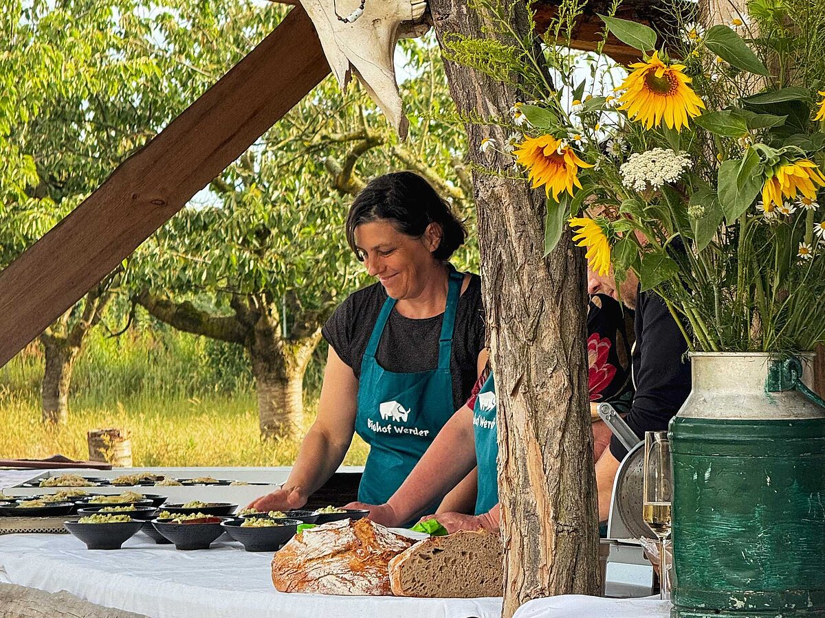 Die Biobaumblüte ist seit Langem eins unserer bekanntesten Events auf dem Biohof Werder. 2024 kam Farm-to-table hinzu – genießt einzigartige Menüs an Sommerabenden auf unserer Obstwiese. Unsere Büffel-Bratwürste findet ihr auf verschiedenen Regionalmärkten. Und brandneu: Catering! Rahel und Claudia beliefern euch mit radikal-regionalem Essen bei Veranstaltungen und Feiern.